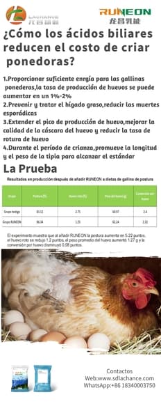 Para los criadores de ponedoras, los aspectos: la tasa de producción, la calidad de huevos, la enfermedad del hígado y la tasa de supervivencia... son ídices más importantes. Sí quieren mejorarlos, aquí tiene un nuevo aditivo que se llama ácidos biliares para ayudarle en esos aspectos. Si le interesa, dígame por favor.