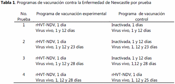 Vacunas. La vacuna rHVT-NDV (Vectormune® HVT_NDV) fue producida por Ceva-Biomune (USA). En todas las pruebas, la vacuna que se aplicó al día de edad fue la cepa PHY-LMV 42. La revacunación con virus vivos se realizó con: Prueba 1: PHY-LMV 42; Prueba 2: LaSota rND-AI; Prueba 3: LaSota y; Prueba 4: LaSota. Las vacunas inactivadas que se aplicaron en las pruebas 1,2 y 3 son elaboradas con la cepa LaSota, provenientes de diferentes laboratorios comerciales.