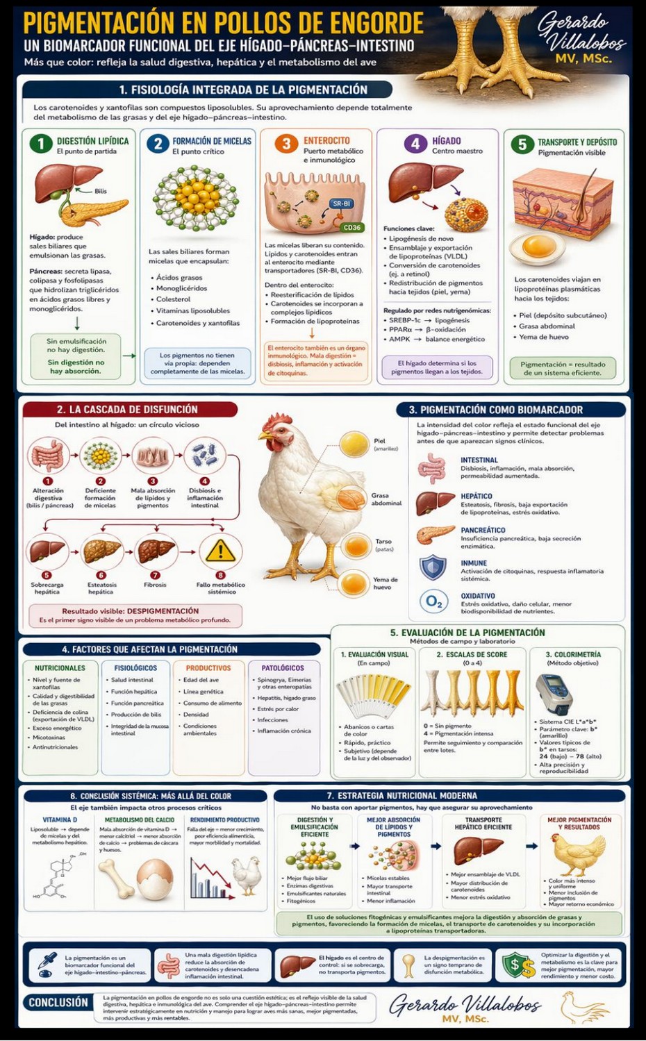 La pigmentación en pollos de engorde ha sido tradicionalmente interpretada como un atributo estético y comercial. Sin embargo, desde una perspectiva fisiológica avanzada, la pigmentación constituye un biomarcador metabólico altamente sensible que refleja la eficiencia funcional del eje hígado–páncreas–intestino, sistema encargado de coordinar la digestión, absorción, transporte y utilización de compuestos liposolubles, incluyendo carotenoides y xantofilas (Leeson & Summers, 2001; Surai, 2016).