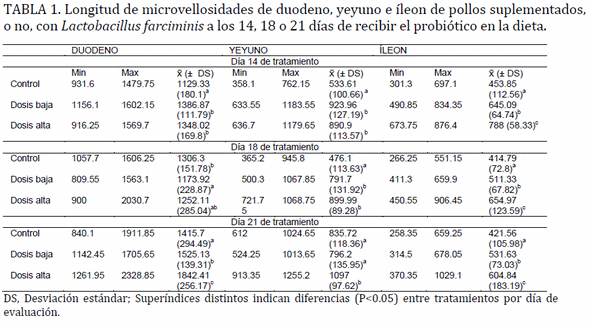 Se usaron 45 pollos de un día de nacidos se mantuvieron en adaptación por 10 días y después se dividieron en tres grupos de 15 pollos por grupo a los que se les suministró alimento sin antibióticos, con o sin L. Farciminis (3 x 1011 UFCg-1)): a) control (alimento sin lactobacilo), b) dosis baja (0,003 gr de lactobacilos kg-1 de alimento) y c) dosis alta (0,03 gr de kg-1 de alimento). Los animales se mantuvieron en jaulas elevadas de 0.5m x 0.5 m x 0.5m, con 5 pollos por jaula. Se les proporcionó agua y alimento ad livitum y temperatura de la habitación controlada según la edad de loa pollos. A los días 0 al 21 de iniciado el tratamiento se registraron diariamente los siguientes parámetros: peso promedio de los animales, consumo de alimento, consumo de agua con la finalidad de analizar los parámetros productivos (Materia seca, Cenizas, Extracto etéreo y proteína cruda), utilizando como control el alimento que se les proporcionó durante ese periodo. Para evaluar la integridad intestinal se hicieron sacrificios en tres tiempos diferentes (5 animales por grupo, los días 14, 18 y 21 de iniciados los tratamientos). Se hicieron cortes de intestino delgado se tiñeron con hematoxilina eosina y se midieron las vellosidades intestinales del duodeno, yeyuno e íleon en un microscopio óptico (Motic® modelo BA210, con cámara incluida) a un aumento de 40X y se evaluaron con un analizador de imágenes (Motic-Images Plus 2.0). Se realizaron un total de 810 mediciones: 5 animales por grupo, 3 grupos, 3 tiempos [14, 18 y 21 días], 3 segmentos intestinales [duodeno, yeyuno e íleon] y 6 cortes por segmento intestinal por animal. La información de parámetros productivos fue analizada por ANOVA. El análisis de la longitud de las microvellocidades se hizo con un Modelo Lineal Generalizado (Stat Graphics Centurión XV).