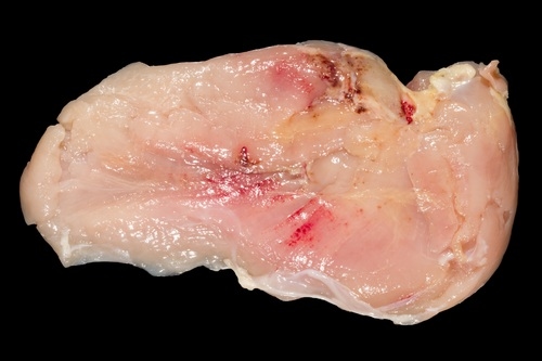 Un ejemplo es este caso de una Pechuga deshuesada y sin piel sin grado con defecto grave en la carne. No se toleran defectos graves de la pulpa. El producto se considera sin calidad y debe mostrarse al representante de la planta