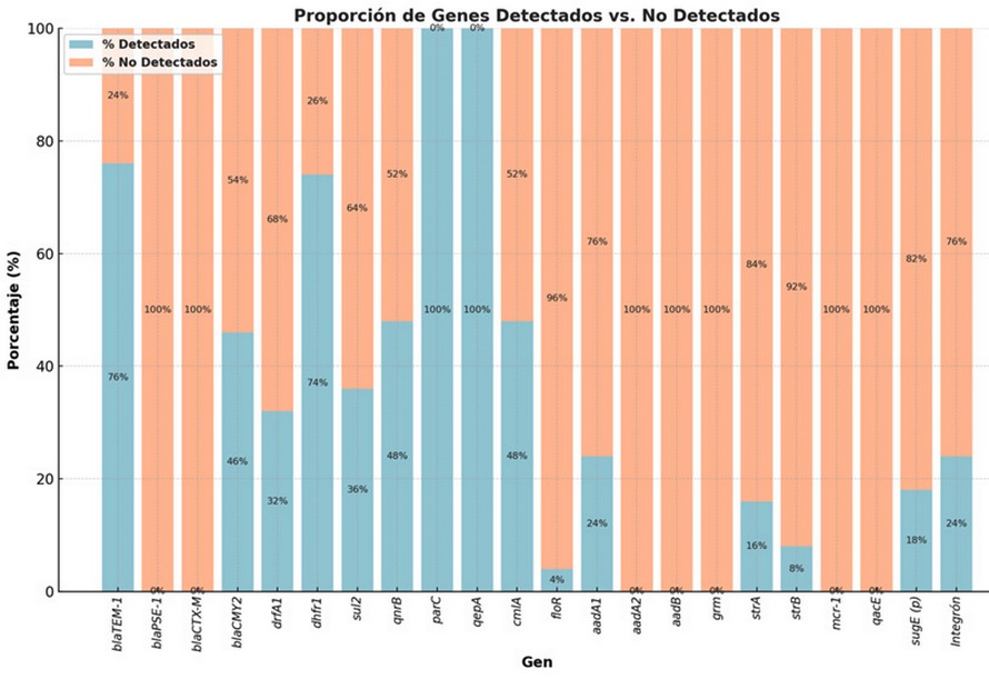 Click aquí para ampliar la imagen Figura 3. Porcentaje de detección de genes mediadores de los mecanismos de resistencia antimicrobiana (RAM) en los aislamientos de Salmonella spp. incluidos en el estudio