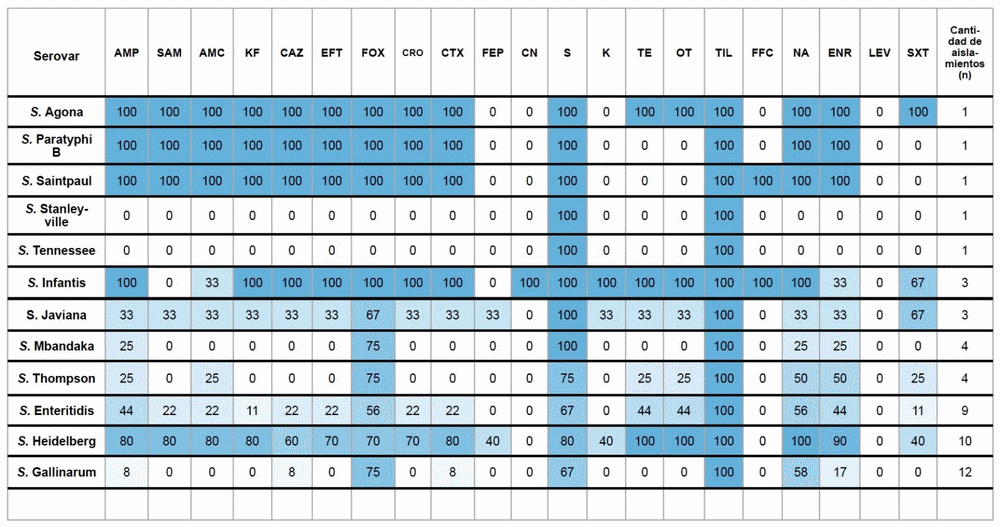Click aquí para ampliar la imagen Tabla 2. Porcentajes de resistencia a los antibióticos en diferentes serovares de Salmonella spp., incluyendo el número de aislamientos por serovar. Los valores se representan mediante un esquema de colores, donde los tonos más oscuros indican un mayor porcentaje de resistencia.AMP: Ampicilina, SAM: Ampicilina sulbactam, AMC: Ácido clavulánico amoxicilina, KF: Cefalotina, CAZ: Ceftazidima, EFT: Ceftiofur, FOX: Cefoxitina, CRO: Ceftriaxona, CTX: Cefotaxima, FEP: Cefepime, CN: Gentamicina, S: Estreptomicina, K: Kanamicina, TE: tetraciclina, OT: Oxitetraciclina, TIL: Tilmicosina, FFC: Florfenicol, NA: Ácido nalidíxico, ENR: enrofloxacina, LEV: Levofloxacina, SXT: trimetoprima/sulfametoxazol.