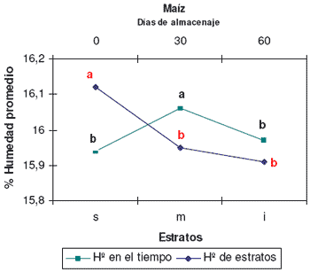En maíz, si bien el análisis estadístico de las humedades promedio detectó diferencias significativas (Figura 6), no presentan ninguna tendencia por estrato y esto fue debido a un muy bajo coeficiente de variación (1,5), que detectó diferencias de 0,07 %, valor ínfimo a fines prácticos. Además, estos niveles de diferencia se encuentran por debajo del error que se maneja en la medición de humedad.