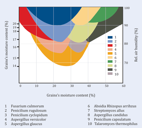 Vemos en el gráfico siguiente cuales son los hongos predominantes en granos para distintos niveles de humedad y temperatura, en el caso de soja debemos pensar en 1 a 2% menos de humedad, ya que el agua libre es mayor que en los cereales para el mismo nivel de humedad.