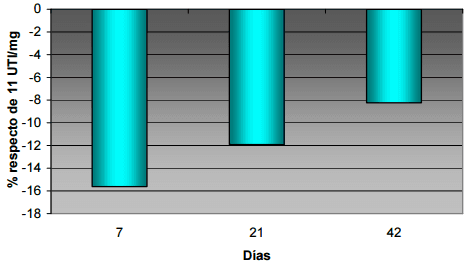 En el Gráfico 3 se representa cómo 21 UTI/mg afectó el peso de la aves de diferentes edades (cambios de alimentos).