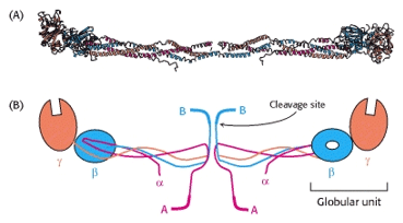 Fig. 5 .Estructura del fibrinógeno. A. Un diagrama donde se muestran las dos regiones α-hélice, conectadas a una región globular. B. Representación esquemática, mostrando la posición de los fibrinopéptidos A y B. - Nelson L. D. Y Cox M.M, 2005 23