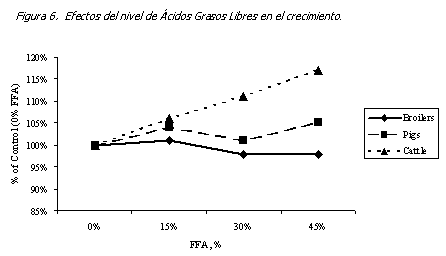 DeRouchey et al. (2004) reportaron que los niveles de AGL no afectan la utilización de la grasa en cerdos jóvenes (6.2 kg) y que no es una medida apta de la calidad. De hecho, conforme en este estudio se aumentó el nivel de AGL en la grasa de 1.8 a 53.3%, se reportó in incremento lineal en el consumo de alimento. Plascencia et al. (1999) reportaron que el nivel de AGL de hasta 42% no afectó negativamente la ingestión de materia seca, ganancia de peso o eficiencia alimenticia del ganado de engorde.