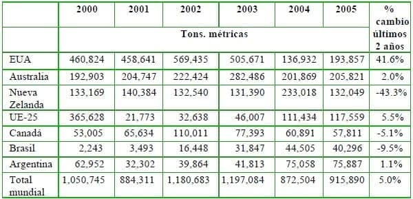 Cuadro 2. Exportaciones de sebo de los principales proveedores, 2000 a 2005.