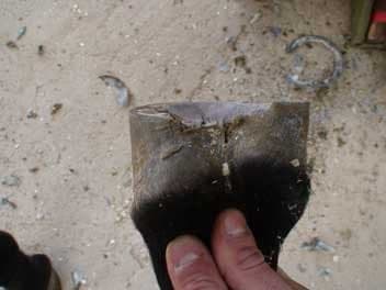 Se nota un gran falseo de flexión en la zona medial del pie, debido a que ese talón ha estado soportando todo el peso del caballo. Nótese el bulbo del talón sobreelevado. Los dos talones poseen el mismo largo, ocurre que el derecho se encuentra en posición normal y el izquierdo sobreelevado.