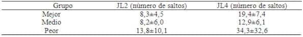 Tabla 4. Valores medios de JL2 y JL4 de los caballos en cada grupo de rendimiento