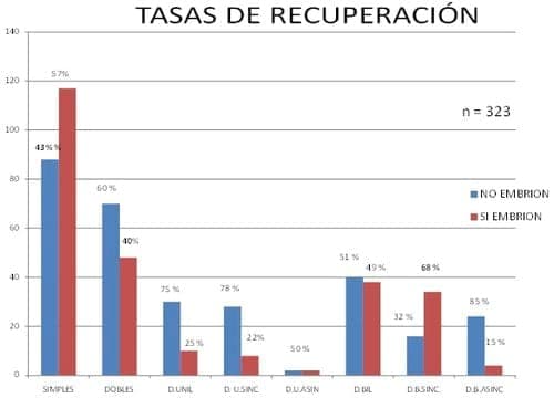En las ovulaciones simples en un 57 % de los casos se obtuvieron embriones mientras que en las dobles solo se recuperaron en el 40 % de los casos.