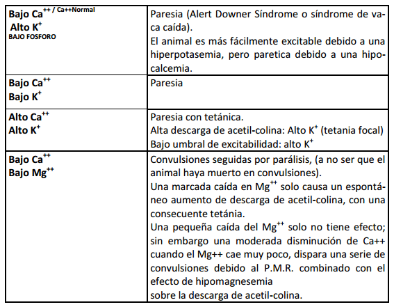 Un aumento de la concentración de K+ está reportado en algunos síndromes paréticos en el ganado (ver tabla 2). La alta concentración EC de K+ disminuye la difusión de este ión desde el interior de la célula al exterior el mayor e importante factor responsable de establecer y mantener el PMR. Si las membranas de las células musculares y nerviosas están despolarizadas e hiperexcitables los signos son convulsiones y tetania.
