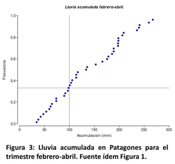 De acuerdo al análisis probabilístico, solo en un tercio de los casos la lluvia acumulada en noviembre-enero superó 130 mm (Figura 2). Este parámetro mejora sustancialmente en el trimestre posterior, febrero-abril, en el que en dos tercios de los casos la lluvia acumulada superó 100 mm (Figura 3).
