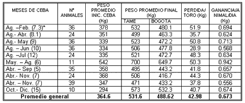 Estudios realizados en Colombia utilizando una capacidad de carga de 2 y 4 animales/ha han reportado gdp de 859 y 820 gr/animal/día (2), los cuales son similares a los resumidos en la Tabla 1. Sin embargo, bajo confinamiento y suplementando con 2 Kg. de torta de algodón se puede alcanzar gdp de 1660 gr/animal/día (5). Lo anterior confirma que con una acertada capacidad de carga los aumentos diarios de peso puede ser equivalente a l os obtenidos en ceba intensiva requiriéndose en ésta costos superiores posiblemente por la mayor demanda de mano de obra.