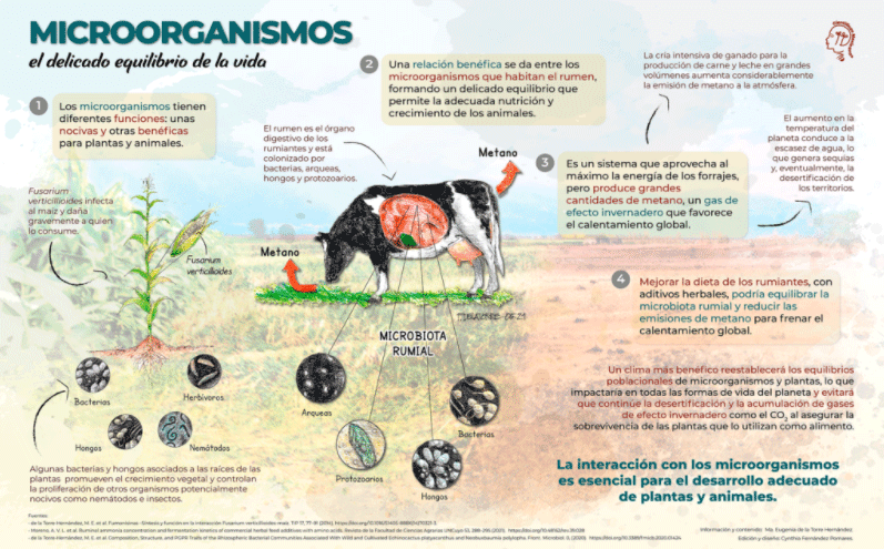 El rumen es, en sí mismo, un complejo nicho ecológico en el que cohabitan grandes cantidades de bacterias, arqueas, levaduras y protozoarios en un equilibrio dinámico que les permite degradar compuestos como la celulosa y la hemicelulosa (que difícilmente pueden ser digeridos por otros organismos) y aprovechar los productos de su descomposición como fuentes energéticas. Como puede apreciarse, la microbiota ruminal es compleja y muy variable en función de la composición del alimento ingerido por los animales, de manera que, si se les ofrecen aditivos alimenticios de origen herbal, ricos en plantas con potenciales antioxidantes o con principios activos de uso medicinal, éstos tienen efecto en la estructura y la composición de la comunidad microbiana ruminal, lo cual permitiría reducir la producción de metano que se libera a la atmósfera, sin afectar el comportamiento productivo de los animales ni la economía de los productores.