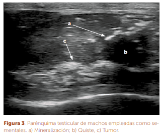Los testículos son el órgano productor de espermatozoides. A la palpación, la mayoría de los sementales mostraron testículos con una consistencia firme, sin presencia de endurecimientos, inflamación o edemas. El 14% restante presentó calcificaciones, tumoraciones y quistes en el parénquima, lo cual fue corroborado a través de ecografía (Figura 3) y 20% quiste en la cola del epidídimo (Figura 4).