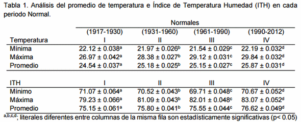 Los promedios ? errores estándar de las temperaturas mínimas, máximas y promedio; así como del ITH mínimo máximo y promedio en cada Normal, se muestran en la tabla 1.
