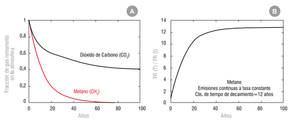 Figura 1 - Decaimiento atmosférico de CH4 y CO2 luego de un pulso de emisión en el año cero (A) y saturación del FR de CH4 como resultado de emisiones continuas a tasa constante (B). Fuente: Kleinberg, 2020