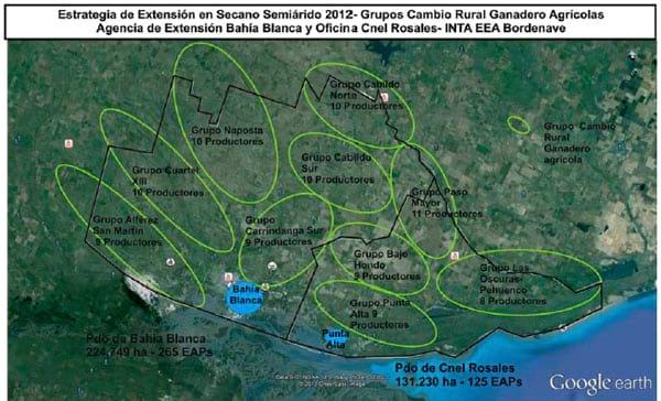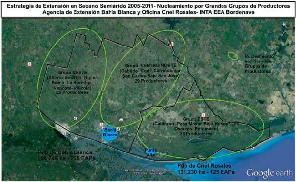 Para mejorar la organización del sistema de extensión local, se consolida una estrategia a través de tres grandes grupos de productores por zonas agroecologicamente semejantes dentro de ambos partidos, con reuniones periódicas en los predios de los integrantes de los grupos (Figura Nº1). En las mismas se analizan ensayos, incorporaciones de planteos productivos en el manejo de los campos y sus resultados para el conocimiento conjunto y cooperativo.