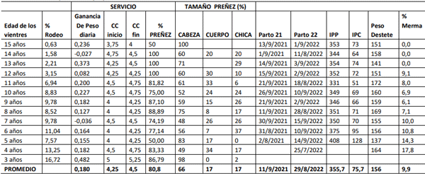 Tabla 1. Resultados productivos y reproductivos de los vientres de la EEA INTA Corrientes ciclo 2022-2023.