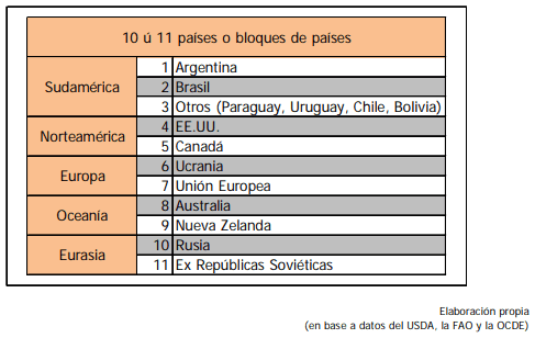 Estos son los 10 ú 11 países o grupos de países que serán proveedores netos de agroalimentos en las próximas décadas. Se los presenta así porque subsiste la duda respecto de las ex Repúblicas soviéticas (el último renglón). En el caso de la Unión Europea, se excluye todo el comercio interno entre sus países miembros.