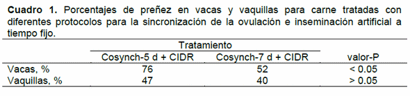 Los resultados de preñeces en vaquillas y vacas se presentan en el Cuadro 1. Las tasas de preñez a los 60 días de haber realizado la IATF en las vaquillas resultaron similares entre los tratamientos (P > 0.05). Se registró tendencia a una mayor tasa de preñeces en las vaquillas del tratamiento Cosynch-5d + CIDR, diferencia que probablemente no fue detectada en el análisis debido a una cantidad insuficiente de animales. En el caso de las vacas, la proporción de hembras preñadas fue mayor (P < 0.05) en el grupo de animales tratado con el protocolo Cosynch-5d + CIDR. Los resultados obtenidos en las vacas del presente trabajo coinciden con los reportados por Bridges et al. (2008) quienes compararon un protocolo de Cosynch de 7 días más un dispositivo vaginal de progesterona con IATF a las 60 horas, contra un Cosynch de 5 días más un dispositivo de progesterona e IATF a las 72 horas en vacas durante el periodo posparto. En ese estudio, las tasas de preñez por inseminación artificial fueron 10.5% mayores con el Cosynch de 5 días. En promedio la tasa de preñez alcanzada con el programa Cosynch de 5 días + CIDR es de 68% en estudios realizados en 23 hatos; en contraste, el promedio de las tasas de preñez para el programa de 7 días es del 54% en estudios realizados en 14 hatos (Larson et al., 2006). Los valores anteriores coinciden con los obtenidos en el presente trabajo. La base fisiológica de este tratamiento (Cosynch-5 d + CIDR) se reduce al tiempo de inserción del dispositivo de progesterona, para evitar los efectos adversos de folículos persistentes sobre la fertilidad de las vacas que no ovulan con la primera aplicación de GnRH y para prolongar el período de proestro con mayores niveles circulantes de estrógenos. La importancia de un proestro prolongado derivó de una serie de estudios que evaluaron la influencia de la madurez folicular sobre la fertilidad sobre bovinos de carne (Bridges et al., 2008).