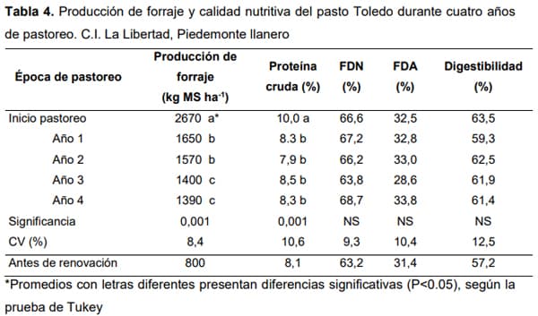 La producción promedia de forraje fue significativamente superior al inicio del pastoreo, como respuesta a la renovación de las praderas, por la mejor fertilidad y menor compactación de los suelos, después de cosechado el maíz. La alta disponibilidad de forraje al inicio del pastoreo (Después de la cosecha del maíz), se redujo en los dos primeros años de pastoreo, a cerca de 1600 kgMS ha-1 y en los dos años siguientes se estabilizó en un promedio de 1390 kgMSha-1 la cual fue superior a la producción de 800 kgMS ha-1 que se obtenía en la pradera degradada (Tabla 4). El beneficio de la renovación de las praderas también se demostró en el mayor contenido de proteína cruda en el forraje durante el primer año de pastoreo. En los años siguientes no hubo variación en la proteína, fibra en detergente nutro, fibra en detergente ácido y digestibilidad, con valores que permanecieron en un promedio de 8.2; 66.5; 32.1 y 61.7, respectivamente (Tabla 4).