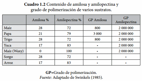 El almidón es un polimero de condensación de glucosa en una proporción de átomos de C, H y O de 6:10:5 que está presente en forma granular en las semillas, tuberculosy raices. La forma y el tamaño del gránulo varía con el grano (Cuadro 1.1) El almidón no es un producto uniforme, la mayoria de los almidones continen dos polímeros: amilosa y amilopectina que se encuentran en proporciones diferentes en los granos (Cuadro 1.2).