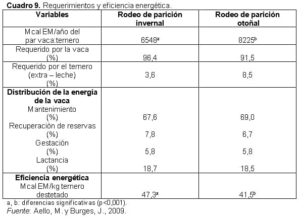 El estudio realizado por Aello, M. y Burges, J. evidencia que en los sistemas donde la vaca pare en otoño se requiere menos energía, y por ende, menos alimento por kg de ternero destetado, es decir que considerando ese aspecto son más eficientes que los sistemas tradicionales con parición en invierno. Como esa mayor eficiencia está explicada por el mayor peso al destete del ternero nacido en otoño, puede inferirse que se podría mejorar también la eficiencia energética de la cría con el manejo tradicional aumentando el peso al destete de los terneros. Pero cabe considerar que el manejo de un rodeo de cría depende de cómo se distribuye la disponibilidad de alimento a lo largo del año, de las necesidades del mercado o de los objetivos empresariales del establecimiento.