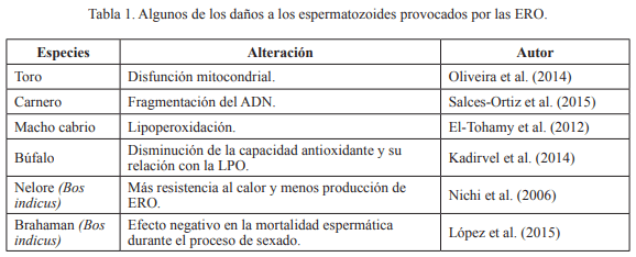 La literatura internacional ha reportado que la elevación de la temperatura intratesticular tiene un efecto adverso sobre la espermato- génesis, provocando la alteración de los pa- rámetros espermáticos y la apoptosis (Jung y Schuppe, 2007). Las causas principales de esta alteración son la formación de ERO que proveen cambios moleculares en el ADN, pro- teínas, lípidos y otras moléculas biológicas que contribuyen a la baja fertilidad en los ani- males (Shekarriz et al. 1995; Jung y Schuppe, 2007; El-Tohamy, 2012). Investigaciones pre- vias usando modelos animales, han sugerido que las alteraciones en las espermatogénesis debidas a la exposición de los testículos a al- tas temperaturas provocan un incremento en el metabolismo, causando en el testículo una alta demanda de oxígeno. Por lo que el flujo sanguíneo del testículo será naturalmente bajo y por consiguiente causará estrés hipóxico en las células del parénquima activando el proce- so de degeneración testicular (Galil y Setchell, 1988; Setchell, 2006; Ramires et al. 2013). El estrés calórico en los testículos de los bovinos altera él porcentaje de motilidad espermática al largo de las estaciones del año (39.15±1.98, 41.25±1.79, 33.80±2.06 y 37.30±2.02, en invierno, primavera, verano y otoño, respectiva- mente). Siendo el verano la estación del año con mayor temperatura ambiental y menor motilidad espermática (Perumal et al. 2017). En bovinos (Braford) criados en regiones tro- picales, los días calurosos aumentan la tempe- ratura testicular y pone en riesgo la espermato- génesis y la calidad seminal. Esto debido a que las altas temperaturas interfieren con el meta- bolismo oxidativo de la glucosa en las células espermáticas como resultado de la disfunción mitocondrial y la generación de ERO (Oliveira et al. 2014; Hamilton et al. 2016).