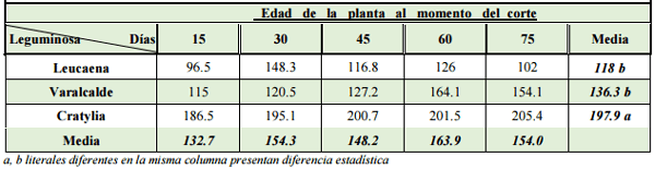 Los resultados obtenidos para la variable longitud de tallos se encuentran en el (Cuadro 2), mostrando significancia entre las edades de corte (P>0.05). La prueba de medias (Tukey P< 0.05) indico que qué la mayor longitud de tallos se presentó los 60 días con una media de 163.92 cm, lo que indica que después de esta edad la elongación de los tallos disminuyó, mientras que el menor crecimiento, como es de esperarse, se registró a los 15 días de edad con 132.7 cm. Cuando realizó la comparación entre las especies, la leguminosa que tuvo mayor elongación de tallos fue Cratylia con una media de 197.83 cm difiriendo ante Leucaena y Varalcalde (P<0.05) con 118.02 y 136.2 cm respectivamente, donde estas últimas no tuvieron variabilidad entre ellas (P>0.05). Los mismos autores antes mencionados reportaron valores inferiores a los reportados en este trabajo.