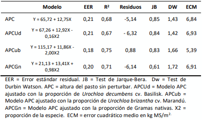 El ajuste del modelo APC con Urochloa decumbens cv. Basilisk (APCUd) no fue significativo (P=0,63), reduciendo el R 2 , aumentando la media de los residuos y acercando valor de DW a 1 (Tabla 2). El ajuste con Urochloa brizantha cv. Marandú (APCUb) y Gramas nativas (APCGn) fue significativo (P< 0,01), aumentando el R2 y reduciendo el error estándar residual. El modelo APCUb permitió la reducción de la media de los residuos y del error cuadrático medio (ECM), mientras que el modelo APCGn causó un aumento de la media de los residuos. Esto pudo deberse al hábito de crecimiento de la Urochloa brizantha cv. Marandú, de forma tupida con culmos geniculadamente ascendentes y con una menor densidad del forraje (Cook et al. 2020).