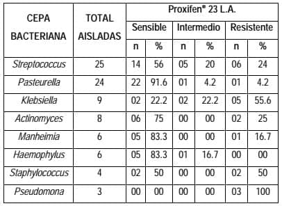 Del total de agentes patógenos aislados (85 cepas bacterianas), 56 aislamientos (65.9%) fueron sensibles al Proxifen® 23 L.A., un 10.6% aislamientos tuvieron sensibilidad intermedia y 23.5% de ellos fueron resistentes.