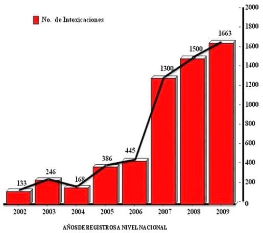 Figura 1. Se muestra en número de intoxicaciones producidas por el consumo de carne contaminada con clenbuterol, ocurridas en México durante los años 2002-2009, el incremento desde el año 2005 al 2009 hay sido significativos, (p<0-05).