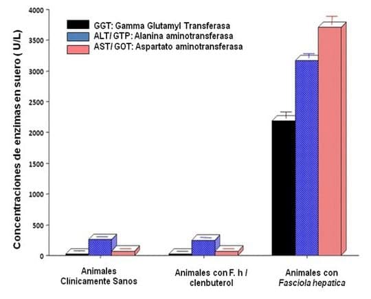 Figura 4: Valores enzimáticos hepáticos de animales clínicamente sanos en comparación con animales con fasciolosis alimentados con clenbuterol, los animales con fasciolosis muestran un nivel muy elevado de enzimas (γGT, ALT/GPT y AST/GOT) el aumento es significativo (P<0.05). En los animales con clenbuterol el comportamiento enzimático es casi similar al de los animales clínicamente sanos. Los animales clínicamente sanos (control) muestran valores muy similares a los animales tratados con clenbuterol y Fh. No, sin embargo, acurre en los animales que solo poseen la enfermedad, determinándose que el Clb enmascara la enfermedad.