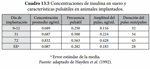Cuando se iniciaron los primeros estudios sobre los mecanismos de acción de los anabólicos, lo primero que se evaluó fueron los cambios sanguíneos en las hormonas relacionadas al crecimiento y metabolitos asociados. Con los avances de la biología molecular, se ha avanzado y se han encontrado diversos efectos y cambios a nivel de expresión de genes. En esta sección se revisa en forma general los principales mecanismos y conocimientos que explican la respuesta anabólica de los promotores de crecimiento en bovinos. Borger et al. (1973a) indicaron que novillos implantados con zeranol mostraron niveles similares de insulina, Hayden et al. (1992) reportan que las concentraciones sanguíneas y la actividad pulsátil de la insulina no se vieron afectados por la administración de estradiol 17β, tba o una combinación de tba y E2 (Cuadro 13.5). En contraste Sharp y Dyer (1971) al día 26 de la prueba, registraron mayores niveles de insulina en novillos implantados con 36 mg de zeranol en comparación del grupo testigo.