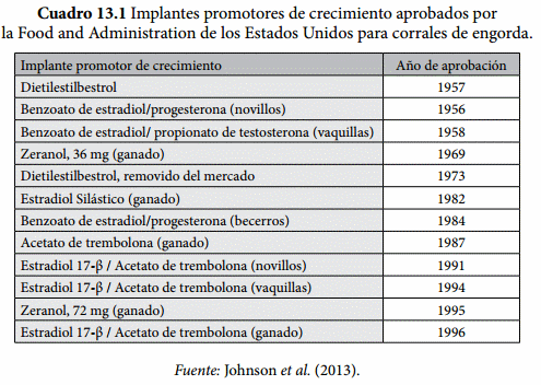 Los implantes más estudiados han sido el dietilestilbestrol, productos a base de lactona del ácido resorcílico, benzoato de estradiol, acetato de trembolona (tba) y 17 β estradiol (Cuadro 13.1). Algunos ya no están en el mercado como el dietilestilbestrol.