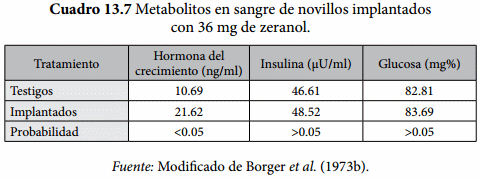 Borger et al. (1973a) demostraron que los implantes con zeranol elevan los niveles de la hornona del crecimiento, lo que permite ganancias de peso de 0.09 kg/día con respecto a los animales no implantados; las características de la calidad de la carne no se vieron afectadas aunque la pérdida por cocción en animales implantados se incrementó (13.1%), merma atribuida a líquidos, debido a que el zeranol estimulan la retención de agua y menor deposición de grasa, con lo que se incrementa la perdida por cocción en el músculo Longissimus (Borger et al., 1973b). Algunos estudios indican que el zeranol puede tener beneficios adicionales al mejorar la tolerancia al estrés por temperatura (Lemieiux, 1987) y al estrés de transporte (Cuadro 13.2). Sin embargo, estos trabajos deberían ser repetidos considerando algunas variables de bienestar animal para confirmar estos beneficios, pues no ha habido más investigación de este tipo.