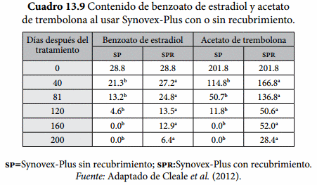 Cleale et al. (2012) caracterizaron la liberación de Synovex-Plus recubierto (15% peso/peso) y sin recubrir (Cuadro 13.9); concluyen que el recubrimiento polimérico aplicado a una tasa del 15% sobre el implantes de Synovex-Plus, prolonga el tiempo de liberación y que el uso del recubrimiento puede aumentar el tiempo de utilización del producto.
