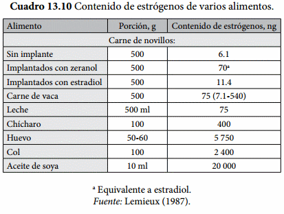 Existen algunas regulaciones para el uso de los implantes; por eso, siempre se debe atender las instrucciones de cada agente anabólico antes de decidir su aplicación en el ganado. Es importante mencionar que la autorización del uso de cualquier agente anabólico, está en función de la seguridad ante la salud pública. El consumo de carne de animales implantados en forma correcta es seguro; se puede pueden comparar los niveles de estrógenos en la carne de animales implantados con otros alimentos para demostrar la seguridad de estos anabólicos en la cadena alimenticia (Cuadro 13.10).