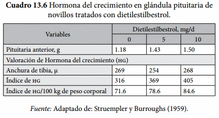 Se sabe que los esteroides sexuales exógenos alteran la secreción de hormona del crecimiento en especies domésticas (Arnold et al., 1996) y las primeras evidencias relacionaban al eje somatotrópico con la acción de los estrógenos sobre el crecimiento de rumiantes por la obtención de glándulas pituitarias más pesadas conteniendo en relación al peso corporal (Cuadro 13.6) (Struempler y Burroughs, 1959). Clegg y Cole (1954) demuestran que los implantes anabólicos son inductores en el crecimiento de células acidofílicas en la pituitaria anterior y se ha observado una mayor proporción (28%) de células somatotrofas en la adenohipófisis de novillos con tba y E2 (Thomson et al., 1996).