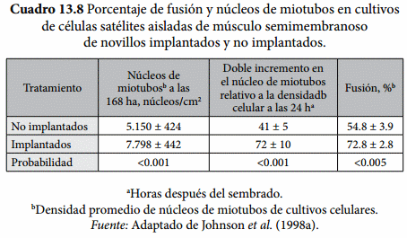 Estudios realizados por Johnson et al. (1998a) muestran que el músculo semimembranoso de novillos implantados con un combinado de tba y E2 presentaron mayor número de células satélite que novillos no implantados (Cuadro 13.8); y se considera que la proliferación de las células satélites y su fusión con la fibra muscular aportando adn, son críticas y limitantes para determinar la tasa y extensión del crecimiento muscular.