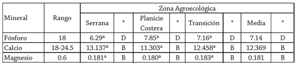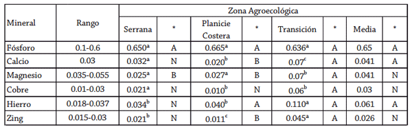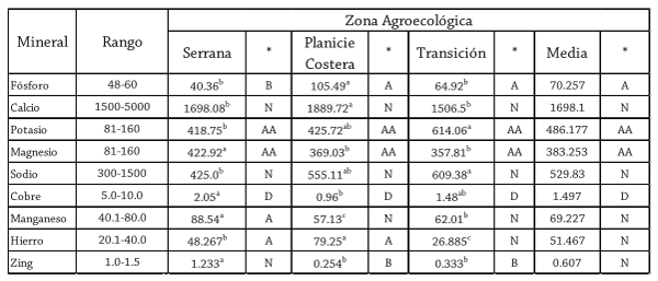 La concentración mineral en forrajes se reporta en el cuadro 2, en el cual se observa que la zona sierra pre- senta diferencias (P < 0.05) con relación a la planicie costera y de transición. También se detectó que el 67% de los elementos se encuentran en altas concentraciones, solo el 17% se encontró como normal y el resto está entre bajo y deficiente.