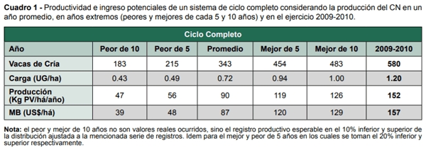 Como se aprecia en el Cuadro 1, el soporte de carga del CN varía desde mínimos de 0.43 hasta valores de 1 UG/ha. De igual forma, la productividad se multiplica por dos veces y media, entre el peor y el mejor de 10 años, mientras el margen bruto se triplica. En el caso del período 2009-2010, la productividad asciende a valores comparables a los obtenidos en praderas cultivadas o mejoramientos de campo de alta productividad, con un margen bruto igualmente elevado.