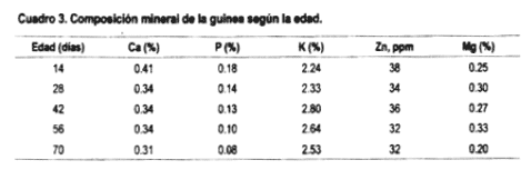Un factor muy importante que afecta considerablemente el contenido mineral delas pasturas está representado por la edad de la planta. En el Cuadro3 se presenta lacomposición mineral de la guinea de acuerdo a su edad.