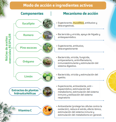 Mucolítico expectorante líquido destinado para aves y bovinos que se utiliza durante los periodos de estrés respiratorio, ayuda a reactivar el apetito y acompañar los mecanismos de defensas naturales de los animales.