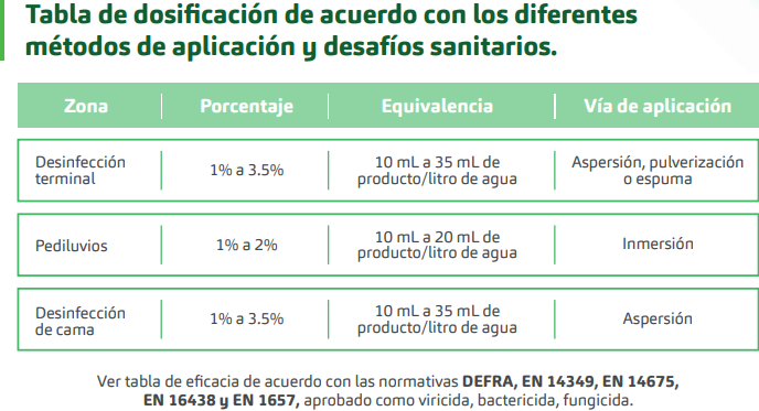 Es un desinfectante de amplio espectro biocida que está recomendado para la desinfección de superficies, equipos y pediluvios. Puede ser utilizado en instalaciones avícolas (pollo de engorde, reproductoras, gallina de postura y pavos) y en producciones porcinas (sitio 1, 2 y 3). Es altamente recomendable para la desinfección de