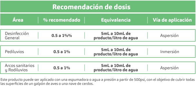 Es un desinfectante de amplio espectro biocida que está recomendado para la desinfección de superficies, equipos, pediluvios y vehículos. Puede ser utilizado en instalaciones avícolas (pollo de engorde, reproductoras, gallina de postura y pavos) y en producciones porcinas (porquerizas de gestación, destete, cría y terminación).
