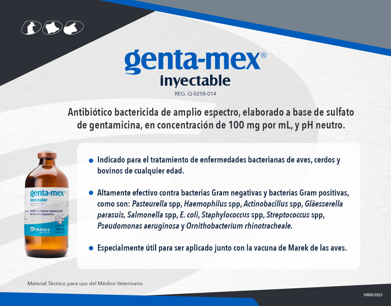 Antibiótico bactericida de amplio espectro, elaborado a base de sulfato de gentamicina, en concentración de 100mg por mL, y pH neutro.